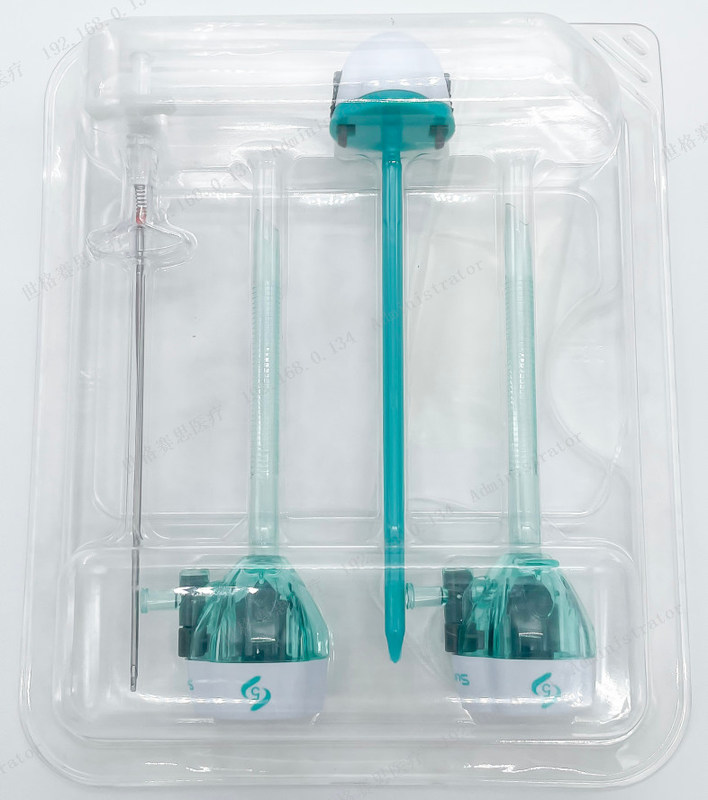 L'ensemble de trocar sans lame contient normalement 3 types de produits: trocar laparoscopique jetable, aiguille veress jetable et sac à échantillons jetable.